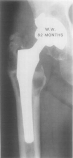 Sin embargo, llamaba la atención el aflojamiento temprano del vástago cementado. En 1970, investigadores encontraron que el cemento óseo generaba una reacción de fagocitosis al PMMA y posterior osteólisis, por lo que terminaba en aflojamiento aséptico de las prótesis ( 21, 22, 23). El estudio subsecuente del aflojamiento de las prótesis permitió aclarar que este no se atribuía a la fagocitosis del PMMA, sino que se trataba de la fagocitosis del polietileno, que generaba osteólisis, migración en la interfase periprotésica de los detritos particulados y terminaba en el aflojamiento subsecuente de los componentes. De ahí data el inicio de investigaciones en tecnología de alta calidad del polietileno, que disminuyen el desgaste y el aflojamiento ( 24, 25, 26) ( figura 3).