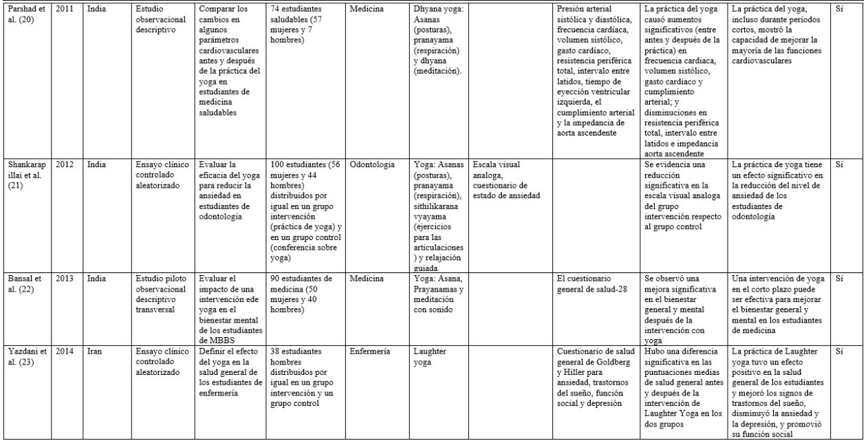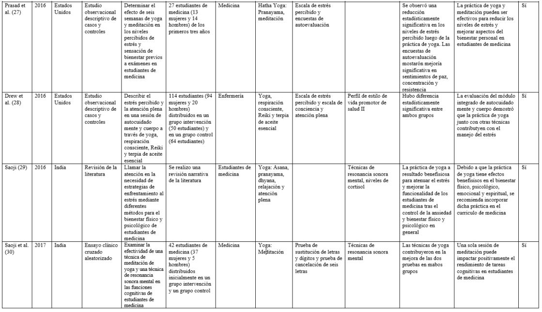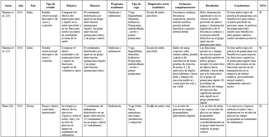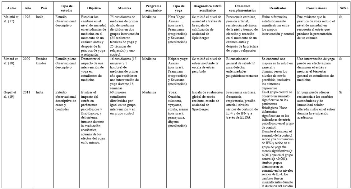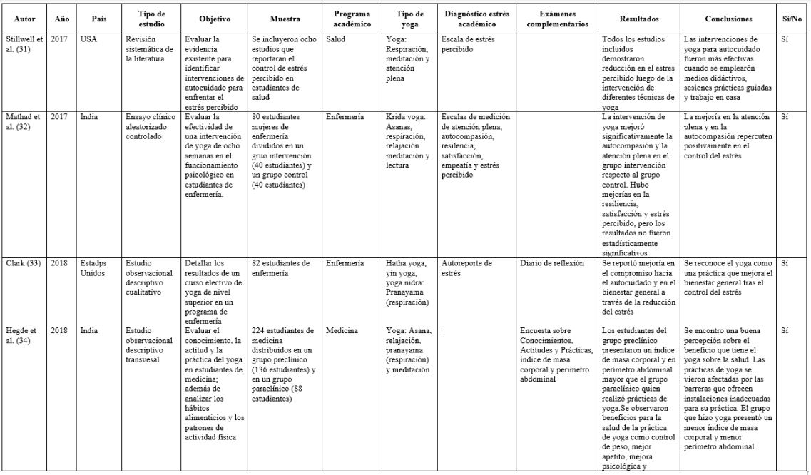 Los dieciocho artículos tenidos en cuenta en esta revisión (17-34) se tabularon bajo las categorías año, país, tipo de estudio, objetivo, muestra, programa académico, tipo de yoga, diagnóstico de estrés académico y exámenes complementarios (véase el anexo).