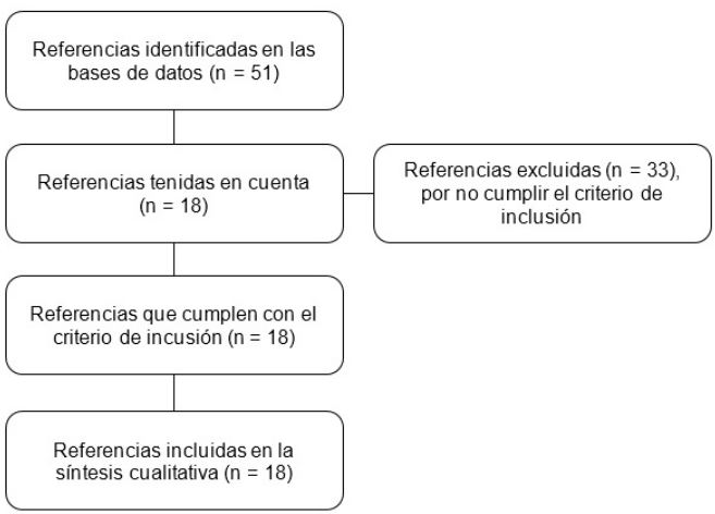 Se realizó una búsqueda sistematizada de la literatura, mediante la declaración PRISMA (16), en la base bibliográfica Medline, por medio de los descriptores en salud stress y yoga, obtenidos en MeSH on Demand, a partir de la pregunta orientadora: What is the relationship between the reduction of academic stress and the practice of yoga in students of the health areas? Una vez validados, se combinaron los descriptores en salud stress y yoga con la palabra clave academic usando el conector boleano AND para hacer más específica la búsqueda. De esta forma, se identificaron 51 artículos, de los cuales se seleccionaron, luego de leer títulos y resúmenes, 18 que cumplían con el criterio de inclusión (responder la pregunta orientadora). El corte de la búsqueda fue octubre de 2020. Finalmente, estos 18 artículos se incluyeron en la discusión cualitativa de la información (figura 1).