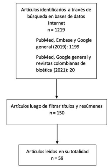 Los criterios de inclusión de fuentes bibliográficas fueron: 1) trabajos originales correspondientes a hallazgos científicos pertinentes; 2) consensos, declaraciones y reportes; 3) artículos de revisión, y 4) artículos de opinión pública publicados en periódicos y revistas. No hubo restricción de fecha de publicación, y se incluyeron documentos en inglés, francés, español, alemán e italiano. Una vez seleccionadas las fuentes bibliográficas, se filtraron títulos y resúmenes para eliminar duplicados, información repetitiva o no relevante, o no relacionada con los criterios anteriores. Posteriormente, se leyeron todos los artículos relacionados, se descartaron los que no se consideraron pertinentes para esta revisión, y con los demás se sintetizó la información. Así mismo, se realizó una búsqueda en PubMed, Google general y en tres revistas indexadas de bioética editadas en Colombia (Revista Colombiana de Bioética, Revista Latinoamericana de Bioética y Persona y Bioética), con los términos MeSH CRISPR-Cas9 AND Colombia en junio de 2021, a fin de complementar la revisión sistemática con reflexiones sobre la aplicación de CRISPR-Cas9 y sus implicaciones éticas desde un país como Colombia (figura 1).