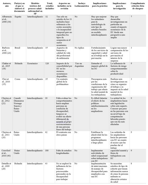 La conclusión general de esta revisión de revisiones es que si bien hay diversidad de marcos conceptuales en cuanto al proceso de comprender las implicaciones de la EC en la población trabajadora, puede existir aún un vacío respecto a entender cómo las condiciones sociales, económicas, del mercado laboral, biológicas y comportamentales se relacionan con la ocurrencia de una EC, más aún en un contexto marcado por cambios macro, como son transiciones demográficas y del perfil de salud de las poblaciones, incluyendo a la trabajadora, asociadas a cambios económicos.