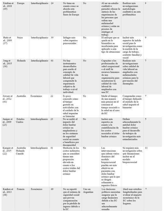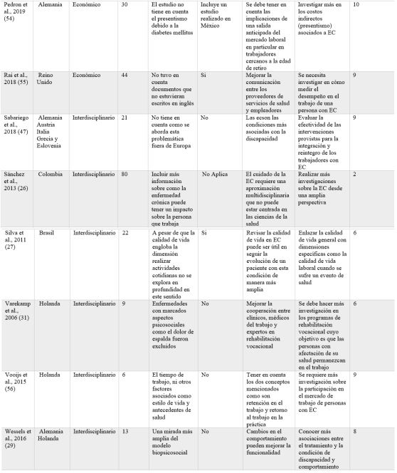 Entre las limitaciones de esta revisión, la más importante es la mirada general de la problemática, puesto que hubiera sido posible centrarse en uno de los enfoques de la comprensión de la EC y cómo afecta a la población trabajadora, pero a la vez es una de las fortalezas de esta investigación: ofrecer una visión de amplio espectro sobre el problema.