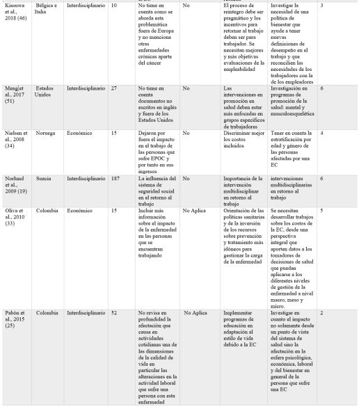 Las dos últimas revisiones incluidas en esta categoría, realizadas por Varekamp et al. (31) y Vooijs et al. (56), se concentran en una retención y rehabilitación que permita la permanencia de trabajadores con EC. El primer trabajo se centró en cómo generar programas de intervención para retornar al trabajo, que le permitan a este tipo de empleados conocer acerca de sus derechos, aumenta la autoeficacia.