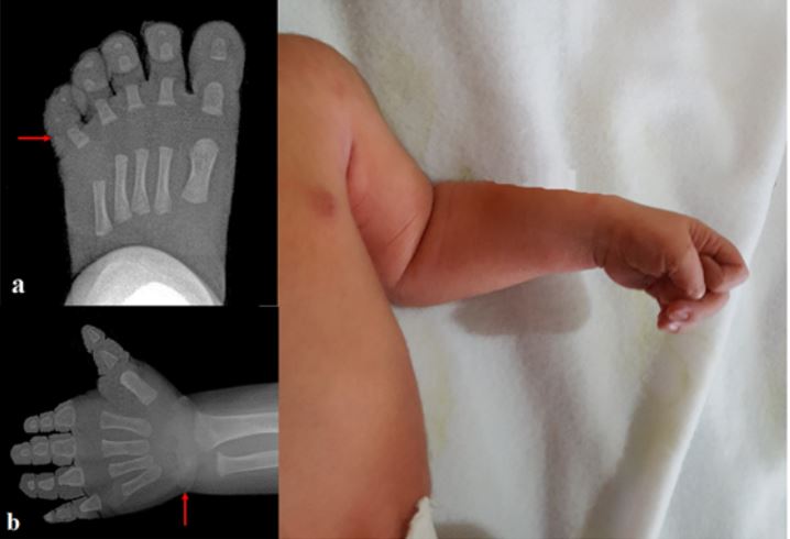 Con ocho meses de edad, la evaluación radiográfica de seguimiento en la consulta externa evidenció retraso en la edad ósea, misma que correspondió aproximadamente para una edad de tres meses (figura 1b), con talla de 64 cm, persistencia entre el percentil 3 y debajo del percentil 10, según las curvas de crecimiento de la OMS. Con persistencia de la limitación generalizada para los movimientos articulares y retraso en el desarrollo motor fino, posiblemente por la falta de movilidad interfalángica. No ha presentado infecciones recurrentes respiratorias y de oído.