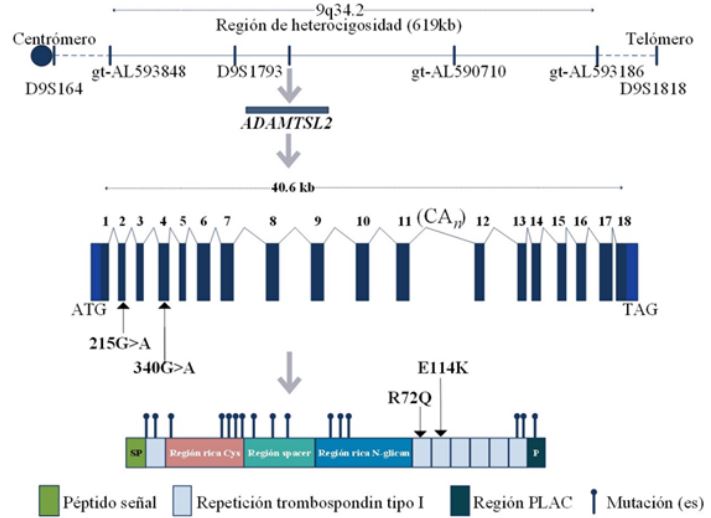 En este estudio fue evidente la presencia de mutaciones con cambio de sentido (missense), debido a que la sustitución de un único nucleótido c.[215G>A]+[340G>A] en la secuencia del gen ADAMTSL2 altera el código en el triplete de bases; por tanto, causa evidentemente la sustitución de un aminoácido por otro p.[R72Q]+[E114K] en la región de seis TSR del producto proteico, que interactúa deficientemente con LTPB1, que a posterior altera la producción, activación del TGFβ (13).