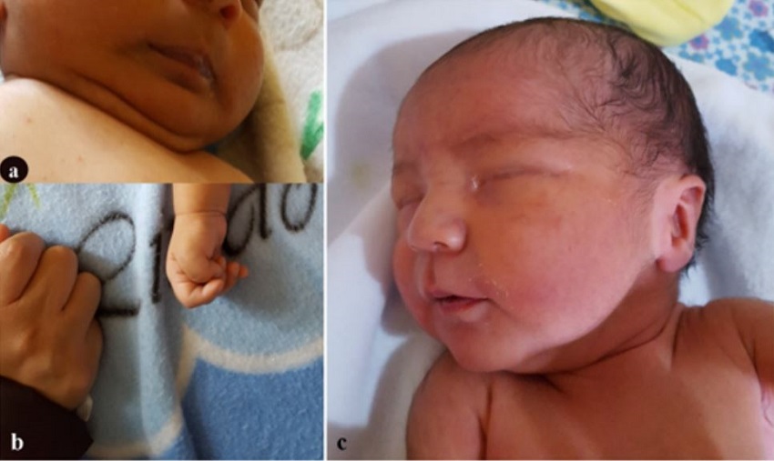 En el examen físico segmentario se observó que el cráneo del recién nacido tenía una fontanela posterior puntiforme, cabello liso, de color negro, con patrón de implantación variable. Facie: redonda, mejillas rellenas, frente amplia con leve hirsutismo, pestañas poco pobladas, cejas escasas, prominente premaxilar, micrognatia; pabellones auriculares; nariz pequeña con dorso nasal amplio, narinas antevertidas, filtrum nasal largo y superficial; boca con apariencia entreabierta, arco de cupido bien definido, con labio superior fino (figura 3a).