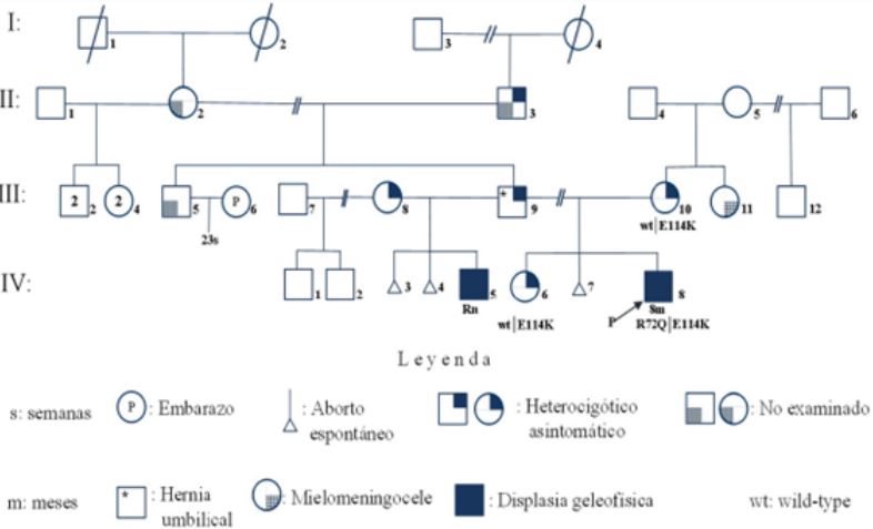 El caso corresponde a un recién nacido (IV-8, según la genealogía) de 20 horas de vida, cuyo caso fue interconsultado al servicio de genética, por talla corta, dismorfias faciales y alteraciones esqueléticas. Entre sus antecedentes contaba: madre de 27 años de edad y padre de 29 años, mestizos, no consanguíneos, sin historia familiar relevante. El embarazo registró polihidramnios (Índice de Líquido Amniótico: mayor de 5) en el tercer trimestre de gestación; además, con una longitud de fémur con 56 mm y húmero de 51 mm, equivalentes para una edad de 32 semanas, en una gestación de 36 semanas. La madre no tenía antecedentes de consumo de alcohol o tabaco durante el embarazo. El estudio de TORCH (toxoplasma, rubéola, citomegalovirus y herpes virus) fue negativo.