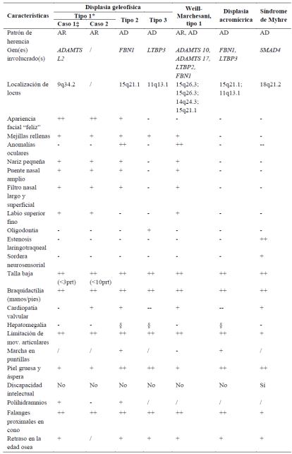 Los pacientes IV-5 y IV-8 de la familia estudiada presentaron dismorfismo facial, coincidente con los hallazgos descritos por Allali et al. (18), quienes concluyeron la presencia de heterogeneidad genética para GPHYSD1. El estudio molecular del paciente IV-8 informó la presencia de una mutación en heterocigosis compuesto para ADAMTSL2, presente solo en el 42% de los casos diagnosticados con GPHYSD1, y de estos el 50% procede de padres no consanguíneos.