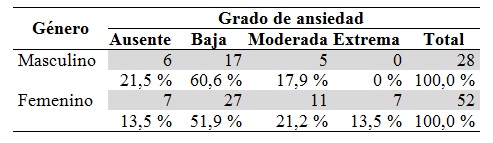 Se halló que 44 pacientes (5,35 %) habían estado levemente ansiosos. Por otra parte, 13 pacientes (13,5 %) estuvieron extremadamente ansiosos. Al desagregar los hallazgos por género, se encontró que los pacientes hombres no presentaron ansiedad en el 21,5 % de los casos (6); en tanto que un 60,6 % estuvo levemente ansioso. No hubo casos de ansiedad extrema entre los hombres. Entre las mujeres, 7 (13,5 %) no experimentaron ansiedad y 27 (51,9 %) estuvieron levemente ansiosas (tabla 1).
