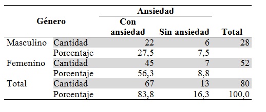 Las mujeres mostraron ansiedad con más frecuencia (56,3 % del total), lo cual es cercano al doble de los casos de hombres (27,5 %). De los 80 pacientes de la muestra, 13 pacientes no presentaron ansiedad (6 mujeres y 7 hombres), lo cual representa el 16,3 % de todos los casos. La presencia de ansiedad fue estadísticamente significativa mayor para el género femenino (z = −2,4; α = 0,05; p = 0,0082).