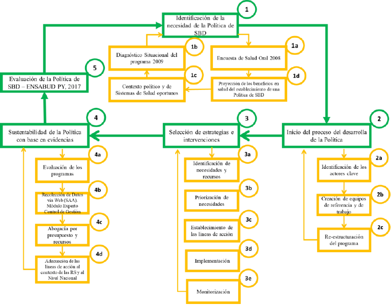 En la figura 1 puede observarse el proceso de desarrollo de la Política Pública Nacional de Salud Bucodental MSPBD del Paraguay “Por el Derecho de Volver a Sonreír” 2009-2018 en el marco propuesto por la OMS para la formulación de políticas públicas de salud bucodental (5).