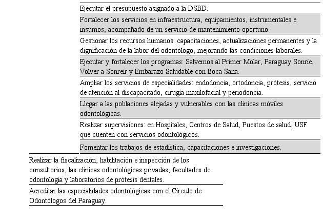 Mejorar las condiciones de SBD mediante la implementación de programas de promoción de la salud, prevención de enfermedades bucodentales, atención a la salud y rehabilitación integral de acuerdo a las políticas del estado paraguayo (2).