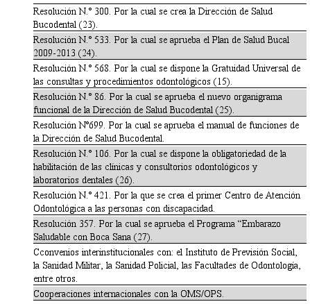 Keywords: advocacy, evaluation of the policy, policy formulation, implementation of the policy, public oral health policy, oral health programs, Paraguay.