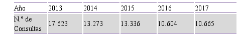 La atención a las poblaciones vulnerables y de difícil acceso, resultado de la continuidad de las atenciones brindadas por las clínicas móviles (buses odontológicos), realizando procedimientos odontológicos que incluían tratamientos preventivos, curativos, de rehabilitación y actividades de promoción de la SBD. En el tabla 5 se muestran las consultas realizadas en las clínicas móviles durante el periodo 2013-2017.