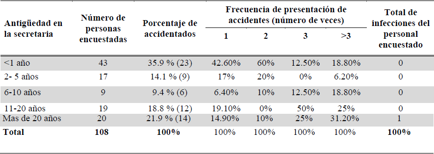 Queda establecido que el grupo de edad que presentó cifras promedio superior de accidentes con objetos punzocortantes fue el de 20 a 29 años de edad, tal vez debido a los años de antigüedad, siendo los de 0 a 1 año de actividad laboral quienes sufrieron mayormente accidentes con un 39.8%, datos similares a los de Collins y Kennedy donde el 48.5% de las enfermeras reportaron accidente laboral por pinchazo y el 17.9 % fue el personal de laboratorio, muy distantes de los resultados de Adegbaye donde el 100 % de los odontólogos habían sufrido algún accidente y un 81 % de los cirujanos han sufrido accidentes con punzocortantes.
