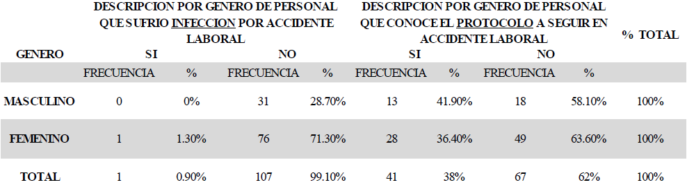 En relación al conocer si habían sufrido alguna infección por un accidente solamente, siendo una mujer odontóloga la única. Referente al conocimiento del protocolo a seguir en caso de accidente laboral 41 (38 %) lo conocen y 67 (62 %) no lo conocen (tabla 2).