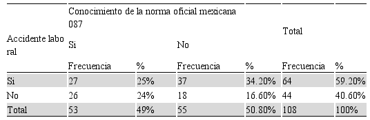 El 38 % de los odontólogos encuestados mencionaron haber tenido capacitación de la Norma Oficial Mexicana SSA 087, sobre protocolos de accidente laboral muy diferente al estudio de Gutiérrez y cols. En trabajadores del primer nivel de atención en Perú donde un 34 % habría sufrido alguna herida con punzocortantes a pesar de que un 66 % recibió capacitación en bioseguridad, lo cual refleja la necesidad tan importante de este tipo de capacitaciones. Sin embargo en nuestro estudio no existe una asociación estadísticamente significativa entre el haber sufrido un accidente por objetos punzocortantes y el conocer la norma 087, dato relevante, ya que de acuerdo a la literatura queda establecido que se presentan más de dos millones de accidentes laborales en el mundo, esto sin tener en cuenta todos los sub registros como es el caso de nuestra investigación donde solo el 59.3 % reportó haber sufrido un accidente laboral.