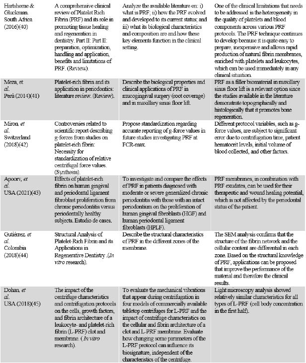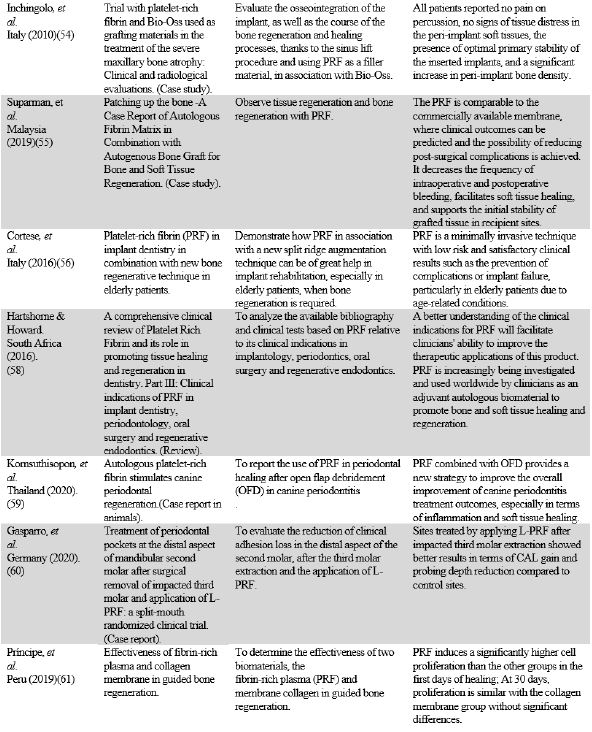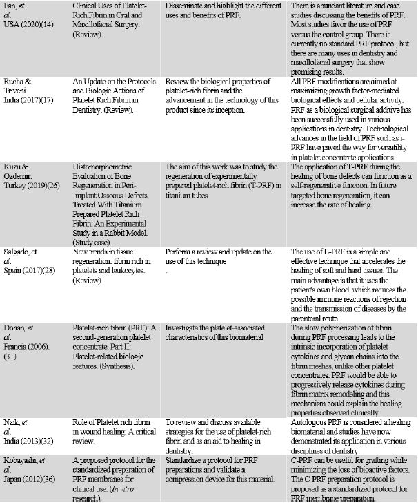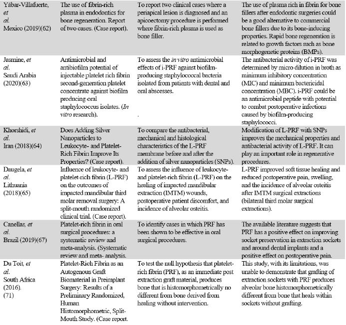 The information search for the integrative literature review was conducted in the integrated search engine EBSCOhost, mainly in the index databases: PubMed, Scopus, Embase, and PROSPERO without language restrictions. Areas of interest were the use of plasma and platelet concentrates in dentistry, regenerative dentistry, tissue regeneration, and tissue engineering. Only studies in English and Spanish and two studies in Portuguese were included. The search was limited to the uses and investigations of PCs in the dental area in clinical studies in humans and in animal models published from 2010 to April 2021. The following keywords with their Boolean connectors were used: “platelet concentrates” OR “ platelet concentrates” AND “PRF (platelet-rich fibrin),” AND “PRP (platelet-rich plasma),” AND “tissue engineering in dentistry.” Of 3,558 titles, 71 were selected (37 reviews, 19 case reports, 9 in vitro studies, 3 animal studies, and 3 consensus). The main selection criterion was the relevance and the authors of the topic. Appendices 1-3 summarize the articles used to conducts this literature report.