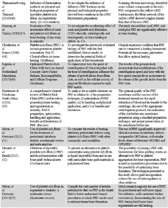 Due to availability and profitability, PRF has obtained more relevance, regarding uses in dentistry, in relation to its predecessor, PRP (50). PRF membranes have no contraindications; they can be used in all types of patients, especially in patients with systemic conditions whose healing is compromised (e.g., diabetics and smokers) and PRP cannot be used in anticoagulated patients (50). Several studies claim that PRF accelerates tissue growth even more, compared to PRP (14,16,25,27,38) (Table 3).