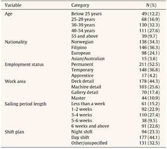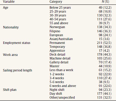 Our sample consists of 402 seafarers working in the offshore oil and gas shipping re-supply industry. Of the total sample, 49 (12.2%) of the workers were 24 years old or younger, 130 (32.3%) were between 30 and 39 years old, 111 (27.6%) were between 40 and 54 years old, and 39 (9.7%) were 55 years or older. The number of women eligible for the present study was so low that the decision was reached not to record sex in order to protect the anonymity of all participants. Regarding nationality, the sample consists mainly of Norwegians (n = 38, 34.2%) and Filipinos (n = 146, 36.3%). Other nationalities include Europeans (n = 98, 24.1%) and Asian/Australian (n = 15, 3.6%). Other demographical variables, including participants’ employment status and years of experience, are presented in Table 1.