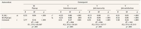 Table 3 presents results from the three models testing the direct and indirect effects of authentic leadership on employee job satisfaction, job insecurity, and intentions to quit the organisation. The direct effect of authentic leadership, controlling for the effect of PsyCap, was statistically significant for intentions to quit (B = -.25, p < .001) and job satisfaction (B = .21, p < .001), but not for job security (B = -.13, p = .11).