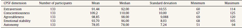 Five-Factor Personality Questionnaire [Chestionarul de Personalitate cu Cinci Factori - CP5F]. This questionnaire was developed by Albu (2008) after the model of the Five-Factor Personality Inventory (FFPI) developed by Hendriks (1997). The CP5F questionnaire contains 130 items, and has the following scales: extraversion (23 items), agreeableness (24 items), conscientiousness (25 items), emotional stability (21 items), autonomy (22 items), and social desirability (15 items). Response options to questionnaire items are 1 (suits me very little), 2 (suits me less), 3 (suits me about half), 4 (suits me much), and 5 (suits me very much).