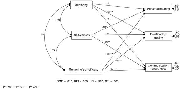 SEM was used to check various relations proposed. It is a multivariate technique that seeks to explain the relationship among multiple variables (Byrne, 2010). The various latent constructs were amputated to get single observed variable for each construct, as recommended by Gaskin (2012) when the number of manifest variables is large. In this study we have self-efficacy (metric variable) as moderating variable between mentoring and its outcomes, i.e., personal learning, relationship quality, and communication. Moderation of metric variable is checked through interaction effect in AMOS software (Baron & Kenny, 1986; Gaskin, 2012; Little, Card, Bovaird, Preacher, & Crandall, 2007, p. 223). In this process three models were created, in which the first model revealed that mentoring significantly affects personal learning, relationship quality, and communication satisfaction (Figure 2). The second model revealed a significant impact of mentoring and self-efficacy (moderator) on personal learning, relationship quality, and communication satisfaction (Figure 3). The third model revealed that the interaction of mentoring and self-efficacy is significantly predicting personal learning (SRW = .383, p <.001), relationship quality (SRW = .567, p <.001), and communication satisfaction (SRW = .648, p <.001) and the model fit indices are also within the threshold limit (Figure 4) (RMR = .012, GFI = .933, NFI = .962, CFI = .963). Further, the R2 of the third model is better than the other two models’ (Figures 2, 3, and 4).