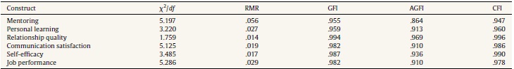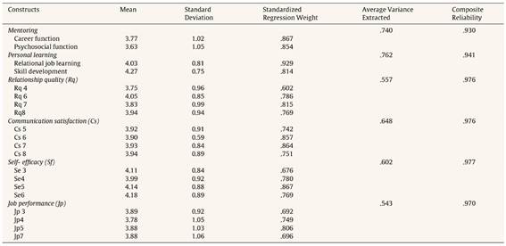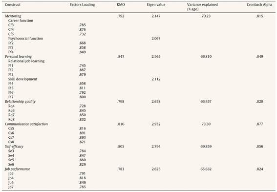 A pilot survey was conducted with 100 bank-employees, selected conveniently, in order to achieve a representative sample. Further, data collected at this stage was also used for an exploratory factor analysis in order to identify the factor structure of all the constructs, as some of the constructs were self generated. The test of appropriateness of a factor analysis was verified through a KMO measure of sampling adequacy, where value greater than .50 is acceptable (Hair, Black, Babin, Anderson, & Tatham, 2010), which indicated its relevance for further analysis. Statements with factor loading less than .50 were deleted (Hair et al., 2010). The mentoring construct comprised 16 items that got reduced to 6 items and converged under two factors. Similarly, the personal learning construct consisted of 7 items that converged under two factors. Further, communication satisfaction, relationship quality, job performance, and self-efficacy consisted of 9, 8, 7, and 8 items respectively, which got reduced to 4 items in case of all the constructs. The detailed results are presented in Table 2. Internal consistency was also measured with the Cronbach's alpha coefficient. Reliability of all the constructs ranged from .76 to .87 (see Table 2). After establishing reliability, the items retained in each construct were used for the final data collection.