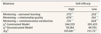Additionally, we also checked the moderation through multi-group analysis by dividing the data into two groups, i.e., high and low. Data has been centred around the mean of the moderating variable, i.e., self-efficacy. Firstly, the parameters for the hypothesized relationship are constrained to be equal and in the second step the parameters are not constrained. If the difference between the two models is significant (p < .05), that means the variable used for splitting the sample moderates the relationship (Jimenez-Jimenez & Sanz-Valle, 2011). The results revealed that the relationship between mentoring and personal learning, relationship quality, and communication satisfaction are significant for the constrained and unconstrained models in both groups. Even though the relationship between dependent and independent is positive for both groups but this, relationship is stronger and significant when the level of self-efficacy is high (Table 6). Therefore, it is concluded that self-efficacy moderates the relationship between mentoring and personal learning, mentoring and relationship quality, and mentoring and communication satisfaction.