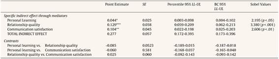 Further, we have three mediators at the same level. This is the case of multiple-mediation, so, in order to check multiple-mediation, we adopted Preacher and Hayes’ (2008) methodology. They recommended bootstrapping of specific indirect effects to reduce omitted parameter bias. Further, including multiple mediators in one model helps to estimate the relative effect of the specific indirect effect associated with all mediators (Preacher & Hayes, 2008, p. 881). In Figure 8 the total effect of mentoring on job performance is significant (c = .408, p <.001). Further, the direct effect of mentoring on job performance became insignificant (c’ = .131, p>.05), which suggests complete mediation. Table 7 represents the parameter estimates for the total and specific indirect effects on the association between mentoring and job performance as mediated by personal learning, relationship quality, and communication satisfaction. The total indirect effect and the specific indirect effects of personal learning, relationship quality, and communication satisfaction are all significant, as reflected by confidence intervals, as upper and lower confidence level do not contain zero (Preacher & Hayes, 2008). Further, inspection of the contrast revealed a significant difference between specific indirect effect of personal learning and relationship quality (Z = 1.9, p <.05), indicating that the relationship quality had a significant greater indirect effect on job performance as compared to personal learning. Therefore, hypotheses 2a, 2b, and 2c are accepted.