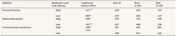 Finally, we investigated the full model through structure equation modelling using the maximum likelihood method in the AMOS programme. In this integrated model we assessed the strength of the relationship between mentoring and job performance through the mediation of personal learning, relationship quality, and communication satisfaction at high and low level of self-efficacy. The moderated mediation is established when the conditional indirect effect of mentoring on job performance in the presence of a moderating variable is significant. The result revealed that moderated-mediation effect of mentoring on job performance through personal learning, relationship quality, and communication satisfaction for both groups is significant, as the indirect relations are significant with 95 percent confidence interval (Table 8).