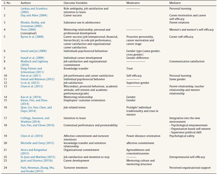 Earlier conceptual and empirical research papers have revealed that mentoring results in job satisfaction (Lo, Thurasamy, & Liew, 2014). In a mentoring relationship the mentor helps the mentee understand his/her job roles and responsibilities, which removes job ambiguity and role ambiguity to a great extent (Lankau & Scandura, 2002), which in turn enhances employees’ job satisfaction (Jyoti & Sharma, 2015a; Lo, Ramayah, & Kui, 2013). The mentor provides career functions and psychosocial functions, and acts as a role model to continuously encourage the mentee to exhibit his/her best talent that motivates him/her to achieve personal as well as organisation goals (Akarak & Ussahawanitchakit, 2008; Emmerik, 2008; Lo et al., 2013). Further, coaching and counselling provided by the mentor with regard to different aspects of job as well as the organisation help to develop loyalty components among the mentees that results in organisational commitment (Ghosh & Reio, 2013), low turnover (Chen, Liao, & Wen, 2014; Payne & Huffman, 2005), emotional sharing (Liu, Jun, & Weitz, 2011), employee satisfaction and perceived career success (Lester, Hannah, Harms, Vogelgesang, & Avolio 2011; Murphy & Ensher, 2001), etc.