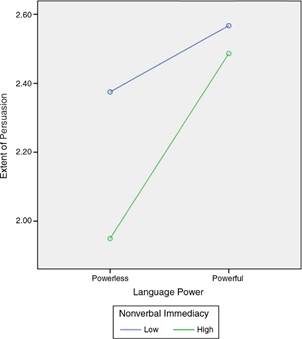Our first two hypotheses address the independent effects that language power and nonverbal immediacy may have on persuasion. Given that both of these variables have the potential to increase the persuasiveness of a speaker through the common mechanism of increasing the perceived power of the speaker, we reasoned that a speaker's use of powerful language, along with a high level of nonverbal immediacy, would likely interact to produce a dramatic increase in the persuasiveness of the speaker. On these grounds, we advance the following interaction hypothesis: