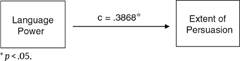 The first regression analysis assessed the total effect of Language Power on Extent of Persuasion (see Figure 3). In this analysis, Language Power was the predictor, and Extent of Persuasion was the criterion. The regression model was significant, F(1, 209) = 4.63, p = .0326, R2 = .022, adjusted R2 = .017, p̂c = .017. Path c was significant, c = .3868, t(209) = 2.15, p = .0326. So, Language Power was a significant predictor of Extent of Persuasion.