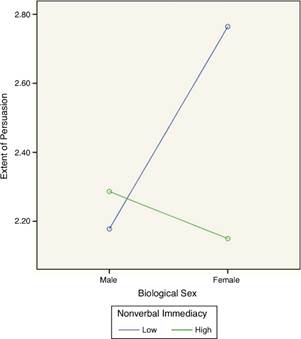 Although there was no main effect for biological sex on the extent of persuasion, there was a statistically significant interaction between biological sex and nonverbal immediacy. Analysis of this interaction revealed a synergistic effect, which resulted from the exposure of female participants to a low level of nonverbal immediacy.