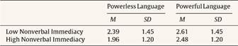 H3. In a sales presentation, the increase in persuasion that is due to language power is significantly greater for participants exposed to a high level of nonverbal immediacy than it is for participants exposed to a low level of nonverbal immediacy.