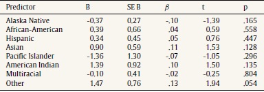 Multiple regression analysis was used to assess the degree of association between the Extent of Persuasion and participant Race. To make this assessment, the nine racial categories in the online survey were treated as a set of eight dummy variables. The category of White non-Hispanic/Caucasian was omitted from the set so that comparisons could potentially be made with this racial category. As a set of dummy variables, participant Race did not explain a significant proportion of the variance in the Extent of Persuasion, F(8, 202) = 1.62, p = .121, R2 = .060, adjusted R2 = .023. The estimated value of the squared population cross-validated multiple correlation or p̂c (Lautenschlager, 1990) was calculated via Cattin's (1980) formula to be .010. See Table 1 for more details of the multiple regression analysis.