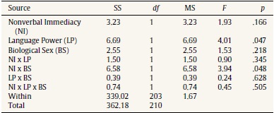 In the third phase of data analysis, Hypotheses 1-3 were tested via a three-way analysis of variance (ANOVA). The independent variables were Language Power (powerless vs. powerful), Nonverbal Immediacy (low vs. high), and participant Biological Sex (male vs. female). The dependent variable was the Extent of Persuasion. The omnibus F for the overall factorial model approached statistical significance, F(7, 203) = 1.98, p = .059, ηp2 = .064. At the same time, however, statistically significant main and interaction effects emerged from the three-way ANOVA (see Table 2).