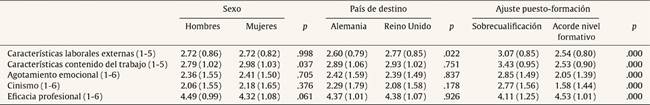 A continuación, se recogen la media y desviación típica de las variables en los diferentes grupos según sexo, país de destino y ajuste del puesto al nivel formativo:
