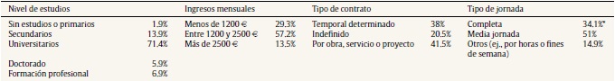 Se halla una tasa de empleo del 91.9%. Sin embargo, antes de emigrar ésta se reducía al 29.9%. La motivación principal para emigrar era la búsqueda de empleo y ejercer una profesión acorde al nivel de formación. A pesar de ello, el 46.1% ejerce funciones por debajo de su cualificación en su puesto de trabajo. El tipo de contrato es en su mayoría por un tiempo determinado (38%) o por obra y servicios (41.5%). En cuanto al horario de trabajo, más de la mitad de la muestra (51%) se adscribe a la media jornada. En la tabla 1 se muestran estas características laborales y los datos referidos al nivel de estudios.