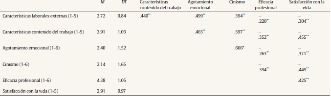 Se muestran en la tabla 2 los niveles de las características laborales externas y del contenido del trabajo, agotamiento emocional, cinismo, eficacia profesional y satisfacción con la vida, así como la correlación entre ellas.