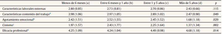 Por otro lado, ha de decirse que las características laborales, tanto externas como del contenido del trabajo, siguen un patrón lineal descendente, mientras que es curvilíneo para las tres dimensiones del burnout. Así, a medida que aumenta el paso del tiempo, los distintos grupos presentan niveles menores en las características laborales negativas estudiadas. Sin embargo, para las variables agotamiento emocional, cinismo y eficacia profesional se obtiene el nivel más alto en las dos primeras y el más bajo para la tercera en el grupo de participantes que se encuadra entre los seis meses y un año de residencia.