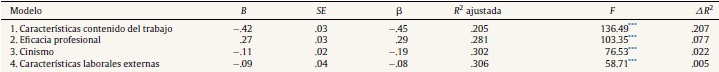 Se realiza un análisis de regresión stepwise para la satisfacción con la vida considerando variables predictivas las características laborales externas, características del contenido del trabajo, agotamiento emocional, cinismo y eficacia percibida. Los resultados muestran que es excluida del modelo de regresión la variable agotamiento emocional. El resto de predictores resultan significativos, explicando el 30.6% de la varianza en el último paso. De ellos, las características relacionadas con el contenido del trabajo explican por si solas el 20.5%, prediciendo en sentido inverso la satisfacción con la vida. Los resultados de los distintos pasos del modelo de regresión se muestran en la tabla 5.