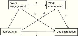 The model describes the relationship between job crafting, work engagement, work commitment and job satisfaction. The model is a multiple mediation that embraces a three-path mediating effect via both work engagement and work commitment (Hayes, 2013; Preacher & Hayes, 2008). Our model allows one mediator (work engagement) to causally affect the other mediator (work engagement) (Hayes, 2013). Multiple mediation reduces estimate errors that separate mediation generates (Golec de Zavala & Van Bergh, 2007; Hayes, 2013; Preacher & Hayes, 2008). The three-path model demonstrates the paths for the unmediated and mediated regressions. The unmediated paths a, b, c, d, e, and f represents hypotheses one to six. By adding the two mediators, we have the three-path mediation models that allows the causality of work engagement on commitment. The paths described by a, b, and c illustrate the mediation effect of work engagement on job crafting-satisfaction relation. Paths a, e, and d is to test work engagement as a mediator on job crafting-work commitment relationship. The paths represented by d, f, and c represent the test of work commitment as a mediator on job crafting-satisfaction relation. Finally, paths e, f, and b, are to test work commitment as a mediator on work engagement-job satisfaction relationship. Hence we formulate three mediation hypotheses as follows: