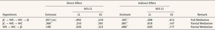 From the results of the multiple mediation analysis, the direct effect was found to be statistically non significant (CI = -.092 to .210, p > .05) with respect to the mediating effects of work engagement and work commitment on the relationship between job crafting and job satisfaction. The corresponding indirect effect was statistically significant (CI = .208 to .412, p < .001). Since the direct effect was significant and the indirect effect significant, we found that work engagement and work commitment fully mediated the job crafting-satisfaction relation.