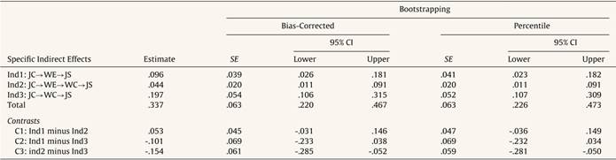 The path analysis of the BC bootstrapping for our multiple mediation model shows the standardized direct and indirect effects of the mediated pathways in the model. The 95% CI of the direct and indirect effects were determined with 2000 bootstrapping re-samples (Preacher & Hayes, 2008).