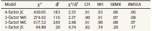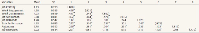 Data presented in Table 6 reveals that the factor models for job crafting, work engagement, and work commitment are, although close to fitness, did not satisfactorily fit the theoretical model. Some of the indices fall within the acceptable criteria, while very few slightly deviated from the criteria. Hence, we concluded that the job crafting, work engagement, and work commitment are relative to their fitness in this study. The result also showed that the one-factor model job satisfaction did not satisfy the criteria for a good model fitness for the current study.