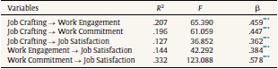 The results presented in Table 2 depicts the simple linear regression analysis to test hypothesis 1 to 3. We found that job crafting positively predicted work engagement, β = .459, F(245) = 65.390, p < .001. The adjusted R2 = .207 shows that 20.7% of the variance in work engagement is explained by job crafting. This value is a large effect (Cohen, 1988). Additionally, our result also showed that job crafting positively predicted work commitment, β = .447, F(245) = 61.059, p < .001. The adjusted R2 = .196 indicate that 19.6% of the variance found in work commitment is explained by job crafting. Similarly, this value illustrates a large effect. Furthermore, we found that job crafting positively predicted job satisfaction, β = .362, F(245) = 36.852, p < .001. The adjusted R2 = .127 shows that 12.7% of the variance in job satisfaction is explained by job crafting. In another analysis, our study showed that work engagement positively predicted job satisfaction, β = .384, F(245) = 42.292, p < .001. The adjusted R2 = .144 shows that 14.4% of the variance in job satisfaction is explained by work engagement. This effect is on the average. Finally, we found that work commitment positively predicted job satisfaction, β = .578, F(245) = 123.088, p < .001. This prediction reveals adjusted R2 = .332, which means that 33.2% of the variance in job satisfaction is also explained by work commitment. According to Cohen (1988), this effect is also large.