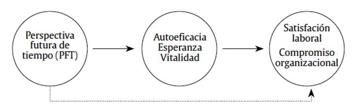 La esperanza y la vitalidad son, de entre una variedad de 24 fortalezas del carácter, las más relacionadas con la satisfacción en diversos ámbitos de la existencia (Park, Peterson y Seligman, 2004), entre ellos el trabajo. La esperanza es un estado mental basado en la sensación interactiva de dos convicciones: que las metas personales se pueden alcanzar (pensamientos de agencia) y que es posible encontrar rutas alternativas que permitan lograr tales metas (planeación) (Snyder, Irving y Anderson, 1991). Debido a su naturaleza motivacional, la esperanza está asociada al trabajo duro, a la persistencia para lograr objetivos (Park et al., 2004) y, por extensión, a los eventos y las reacciones positivas vinculadas al trabajo y a la organización. A su vez, esta fortaleza del carácter está influenciada por rasgos que inclinan a la planeación y a los pensamientos de agencia (Snyder, Rand, King, Feldman y Woodward, 2002). En este punto es relevante la PFT, pues se caracteriza tanto por la previsión de estados futuros de existencia como por la persistencia para alcanzar metas (Zimbardo y Boyd, 1999). Esto último, por supuesto, implica la creencia de que el esfuerzo conduce a resultados (Epel, Bandura y Zimbardo, 1999) y, por tanto, pensamientos de agencia directamente relevantes al desarrollo de la esperanza. Si este factor se asocia al logro de metas y además puede tener fundamento en la PFT, es posible que medie la relación entre la PFT y las actitudes de satisfacción laboral y compromiso organizacional.