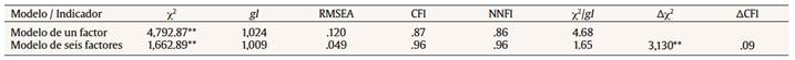 La Tabla 1 indica que no sólo los resultados del AFC de seis factores son superiores a los del modelo de un solo factor, sino que sus indicadores de bondad de ajuste están por arriba de los parámetros establecidos (RMSEA ≤ .05, CFI ≥ .95, NNFI ≥ .95; Kline, 2011), indicando un ajuste apropiado de los datos. Como también se aprecia en la Tabla 1, el valor de la prueba de diferencias en 2 (∆2 = 3130) es significativo a nivel de .01, confirmando la superioridad de la solución de seis factores. En conjunto, la evidencia sugiere que no sólo los reactivos se agrupan adecuadamente en los factores a los que teóricamente pertenecen, sino que éstos se diferencian suficientemente bien entre ellos como para reflejar una estructura de covarianza congruente con las escalas utilizadas.